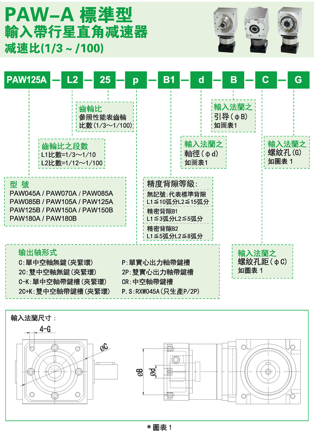 多樣化:輸出軸種類多樣化,有單出力軸型、雙出力軸型、中空軸型、中空法蘭型、中空軸錐形緊迫性、螺桿直線型、螺牙直線型。