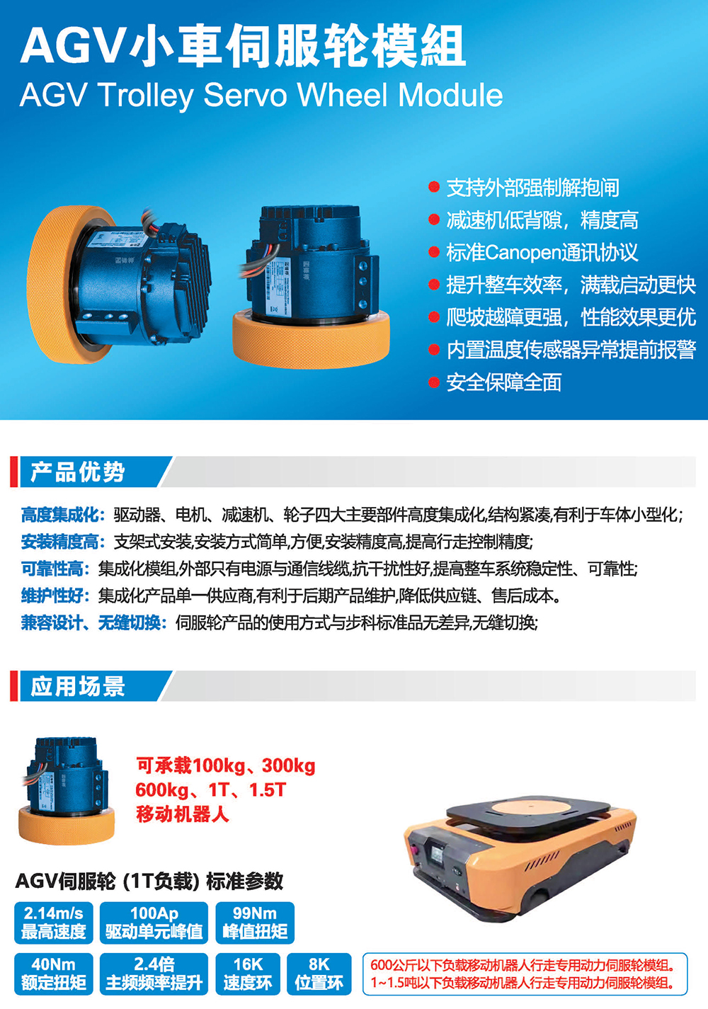高度集成化:驅(qū)動(dòng)器、電機(jī)、減速機(jī)、輪子四大主要部件高度集成化結(jié)構(gòu)緊湊有利于車體小型化;