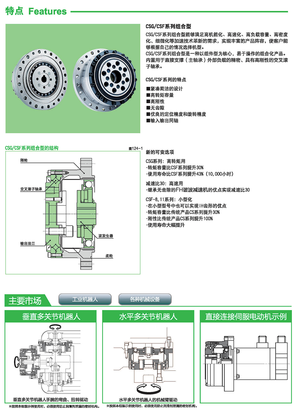 CSG/CSF系列組合型能夠滿足高機能化、高速化、高負載容量、高密度化、細微化等加速技術革新的需求,實現豐富的產品陣容,使客戶能夠根據自己的情況選擇機型。