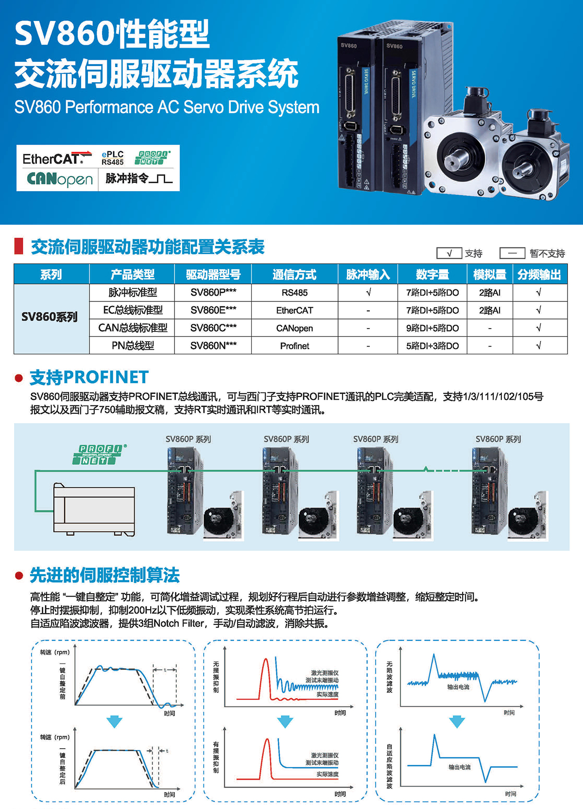 高性能"鍵自整定"功能,可簡化增益調(diào)試過程,規(guī)劃好行程后自動進行參數(shù)增益調(diào)整,縮短整定時間。停止時擺振抑制,抑制200Hz以下低頻振動,實現(xiàn)柔性系統(tǒng)高節(jié)拍運行。自適應(yīng)陷波濾波器,提供3組Notch Filter, 手動/自動濾波,消除共振。