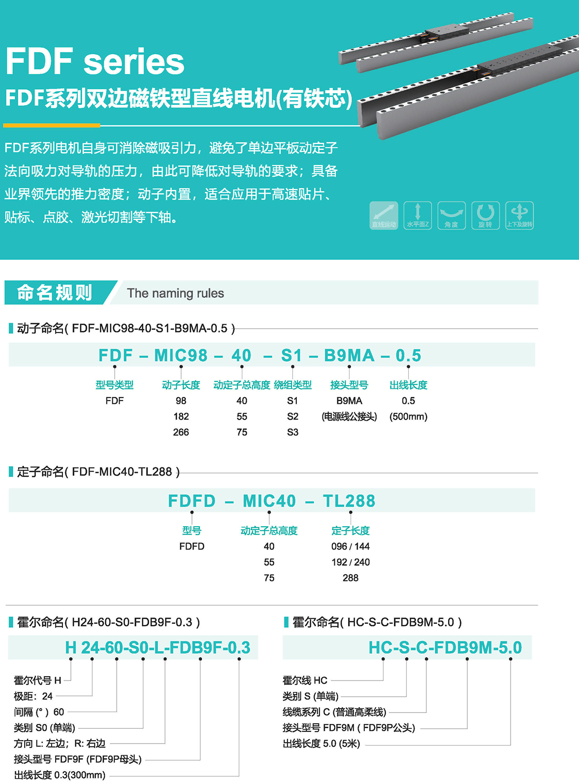 FDF系列電機(jī)自身可消除磁吸引力,避免了單邊平板動(dòng)定子法向吸力對導(dǎo)軌的壓力,由此可降低對導(dǎo)軌的要求;具備業(yè)界領(lǐng)先的推力密度;動(dòng)內(nèi)置,適合應(yīng)用于高速貼片、貼標(biāo)、點(diǎn)膠、激光切割等下軸。