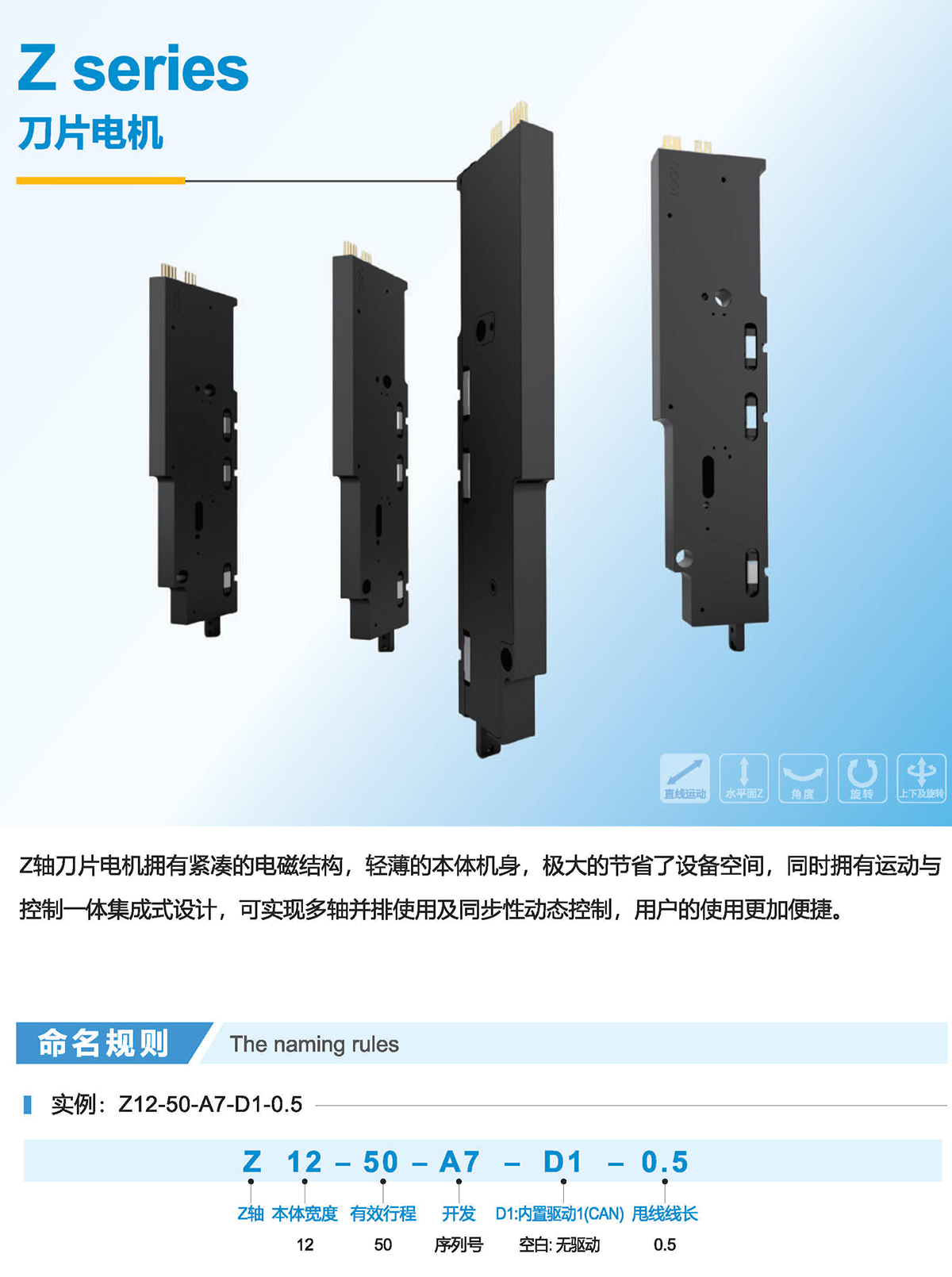 Z軸刀片電機擁有緊湊的電磁結構,輕薄的本體機身,極大的節(jié)省了設備空間,同時擁有運動與控制一體集成式設計,可實現(xiàn)多軸并排使用及同步性動態(tài)控制,用戶的使用更加便捷。